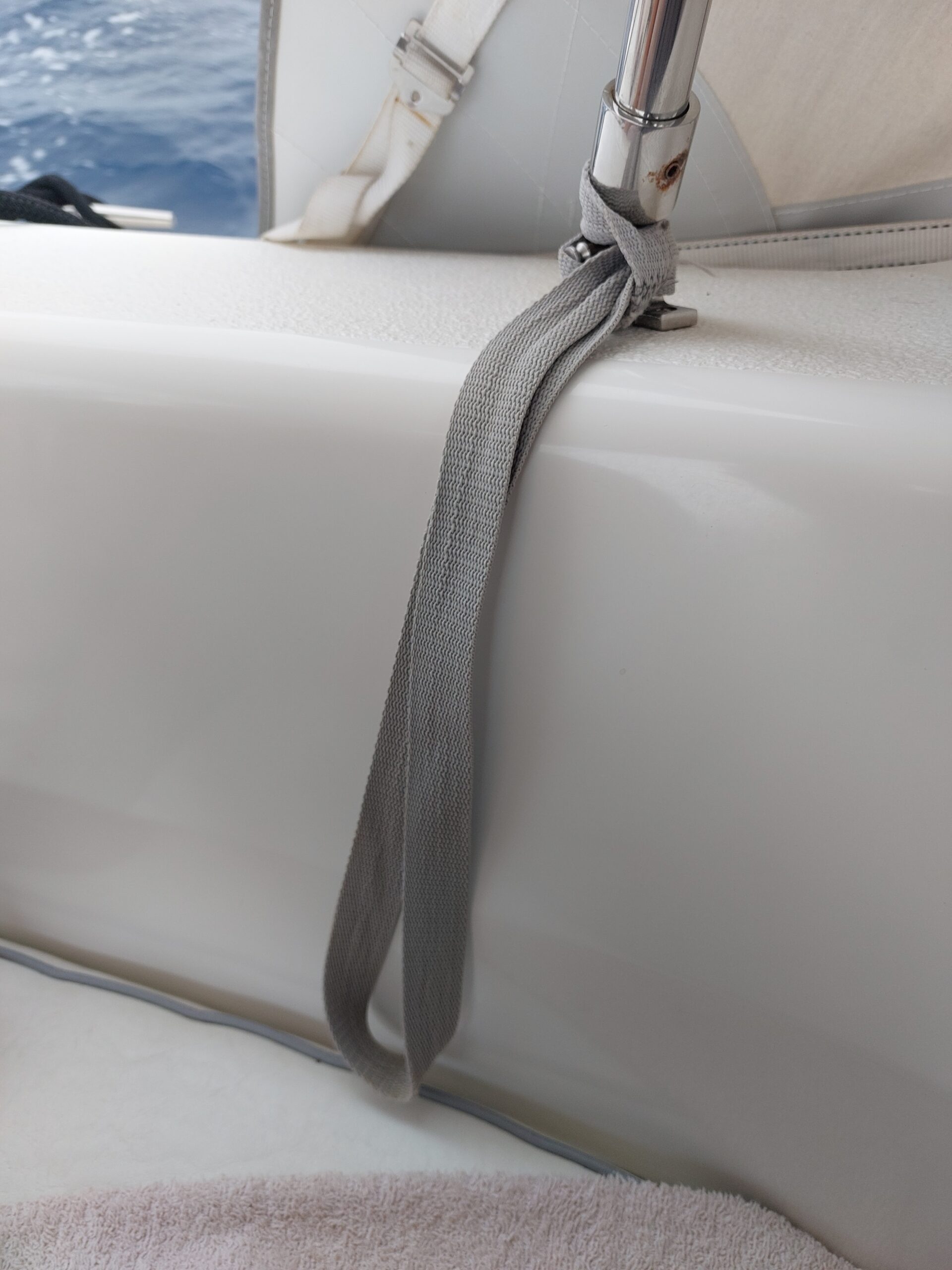 Wir haben vor der Abfahrt aus Gurtband sehr viele Halteschlaufen genäht, die im Salon an den Haltegriffen angebracht sind und auch in der Plicht. Rund um den Cockpittisch haben wir ein Rundumlaufgurtband installiert. Im Salon legen wir immer die Rettungsweste an, bevor es nach draußen geht. Bei viel Seegang und während der Nachtwache picken wir uns mit dem Lifebelt in dem Rundlaufgurt ein. Bei sämtlichen Arbeiten außerhalb des Cockpits ist Rettungsweste und Lifebelt obligat. Die Lifebelts haben einen kurzen und einen langen, durch eingenähtes Gummiband, reckbaren Teil. So läßt es sich hiermit sehr gut arbeiten.